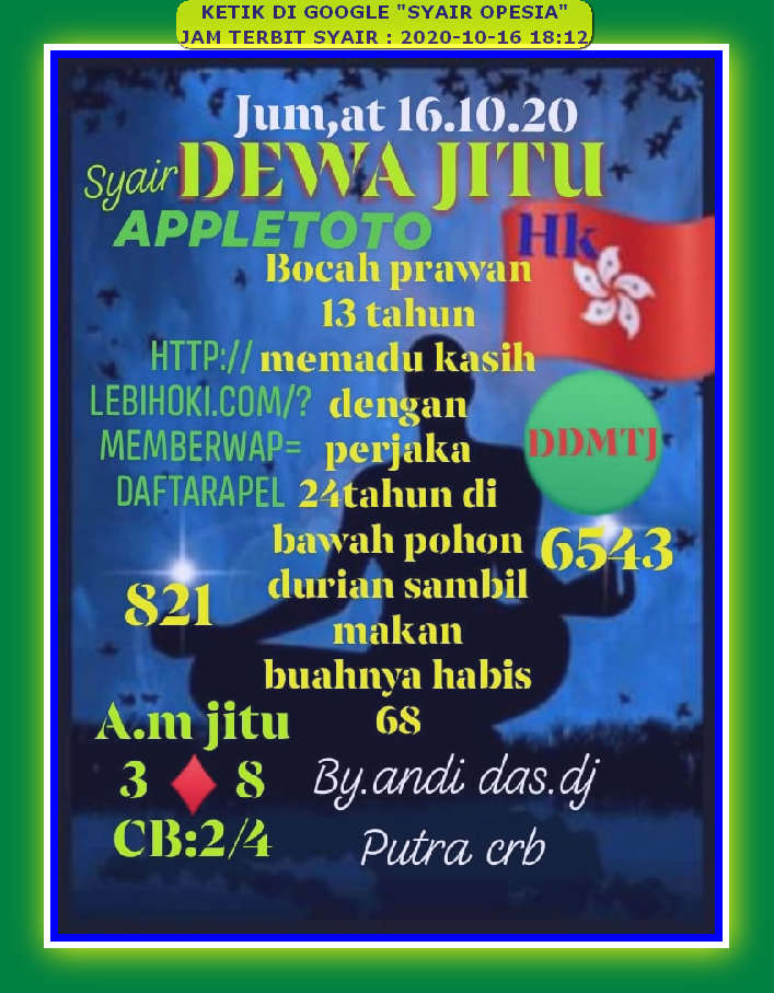 Sekiranya Prediksi Syair malam ini serta Bocoran Hongkong wla yang ada di atas bisa membantu para anda sekalian dalam mencari acuan nomor togel yang hendak di pertaruhkan dan untuk info tambahan bahwa gambar - gambar syair yang ada di atas akan selalu diganti setiap harinya sesudah pasaran HKG keluar pada jam 23.00 WIB maka dari itu jangan sampai ketinggalan gambar syair hk terbaru kami ya. Syair hk, kode syair hk malam ini terlengkap, forum syair hongkong hari ini, syair togel hongkong jitu kami sajikan untuk anda para pecinta t.. harimau, sakuratoto, forumsyair, syairterkini, gucci mas, serigala, nagasaon, syair jawa, syair bola api, syair ramalan dan syair terkenal lainnya. Jadi gunakanlah syair syair ini untuk menghasilkan.